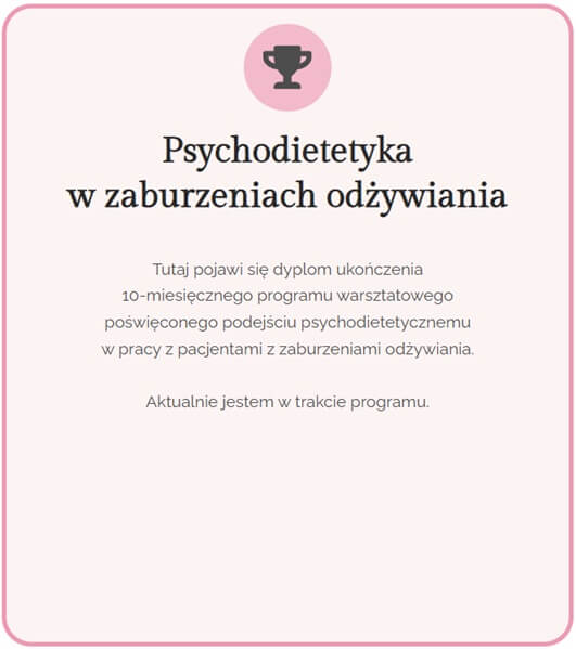 Kiedy jednak dowiedziałam się o istnieniu zawodu psychodietetyka, zachwyciłam się. Pomyślałam: to jest to! W mojej ocenie bowiem psychodietetyka jest dokładnie tą dziedziną, która ma szansę nieść kompleksową pomoc osobom zmagającym się z zaburzoną relacją z jedzeniem, ciałem i ruchem – i to wcale nie tylko tym, którzy otrzymali diagnozę zaburzeń odżywiania. Psychodietetyka łączy sferę odżywiania ze sferą psychiki, dzięki czemu trafia w sedno trudnych doświadczeń związanych z jedzeniem, ruchem i obrazem ciała. W procesie psychodietetycznym pracuje się z przekonaniami, myślami, uczuciami i zachowaniami, które czynią człowieka nieszczęśliwym. Podjęłam decyzję, że aby stać się lepszym wsparciem dla osób pragnących wyjść z zaburzeń odżywiania, zostanę psychodietetyczką.
