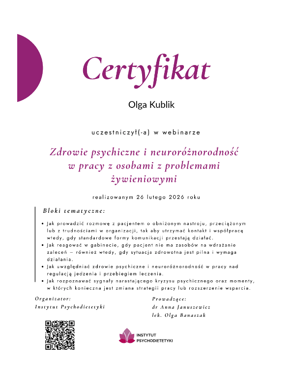 Kiedy jednak dowiedziałam się o istnieniu zawodu psychodietetyka, zachwyciłam się. Pomyślałam: to jest to! W mojej ocenie bowiem psychodietetyka jest dokładnie tą dziedziną, która ma szansę nieść kompleksową pomoc osobom zmagającym się z zaburzoną relacją z jedzeniem, ciałem i ruchem – i to wcale nie tylko tym, którzy otrzymali diagnozę zaburzeń odżywiania. Psychodietetyka łączy sferę odżywiania ze sferą psychiki, dzięki czemu trafia w sedno trudnych doświadczeń związanych z jedzeniem, ruchem i obrazem ciała. W procesie psychodietetycznym pracuje się z przekonaniami, myślami, uczuciami i zachowaniami, które czynią człowieka nieszczęśliwym. Podjęłam decyzję, że aby stać się lepszym wsparciem dla osób pragnących wyjść z zaburzeń odżywiania, zostanę psychodietetyczką.